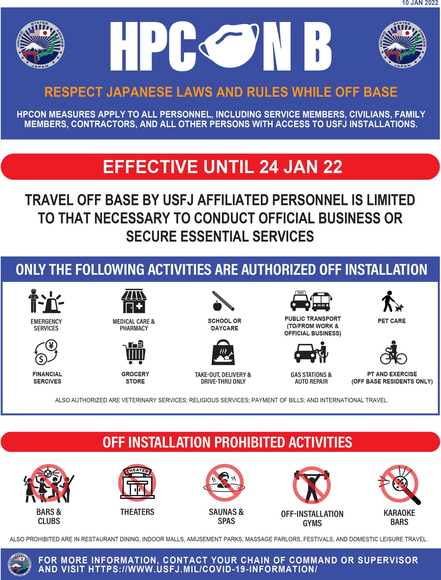 U S Forces Japan On Twitter Effective 10 January 2022 For The Next 14 Days Until 24 January 2022 All Usfj Affiliated Personnel Will Limit Off Installation Activities To Essential Activities Only Visit Https T Co 0rdxqiz2gn